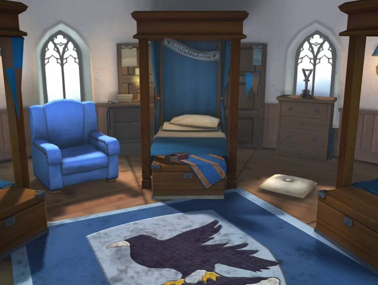 Уютные круглые спальни, обставленные в традиционных дому тонах. Широкие кровати расставлены по кругу, с потолка над ними свисают плотные синие пологи. У каждой кровати стоит тумбочка с личными принадлежностями студентов, под кроватью или рядом с ней обычно хранится чемодан с менее важными вещами. На противоположных входным дверям стенах, окна с широкими подоконниками. Рядом с большим общим деревянным шкафом в каждой спальне дверь, ведущая в душевую, там же в каждой спальне висит старинное зеркало.